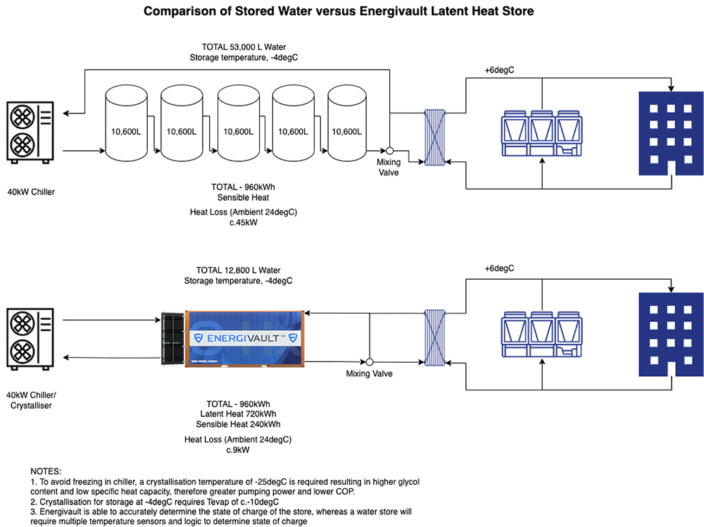 The innovative design of the EnergiVault® thermal battery significantly enhances the energy storage capacity during the charging phase. It achieves this by transforming up to 60% of the working fluid within the EnergiVault® into minuscule spherical ice particles, each measuring less than 0.1mm in diameter. These particles, commonly known as Phase Change Material (PCM), are pivotal in the system’s efficient energy storage process.